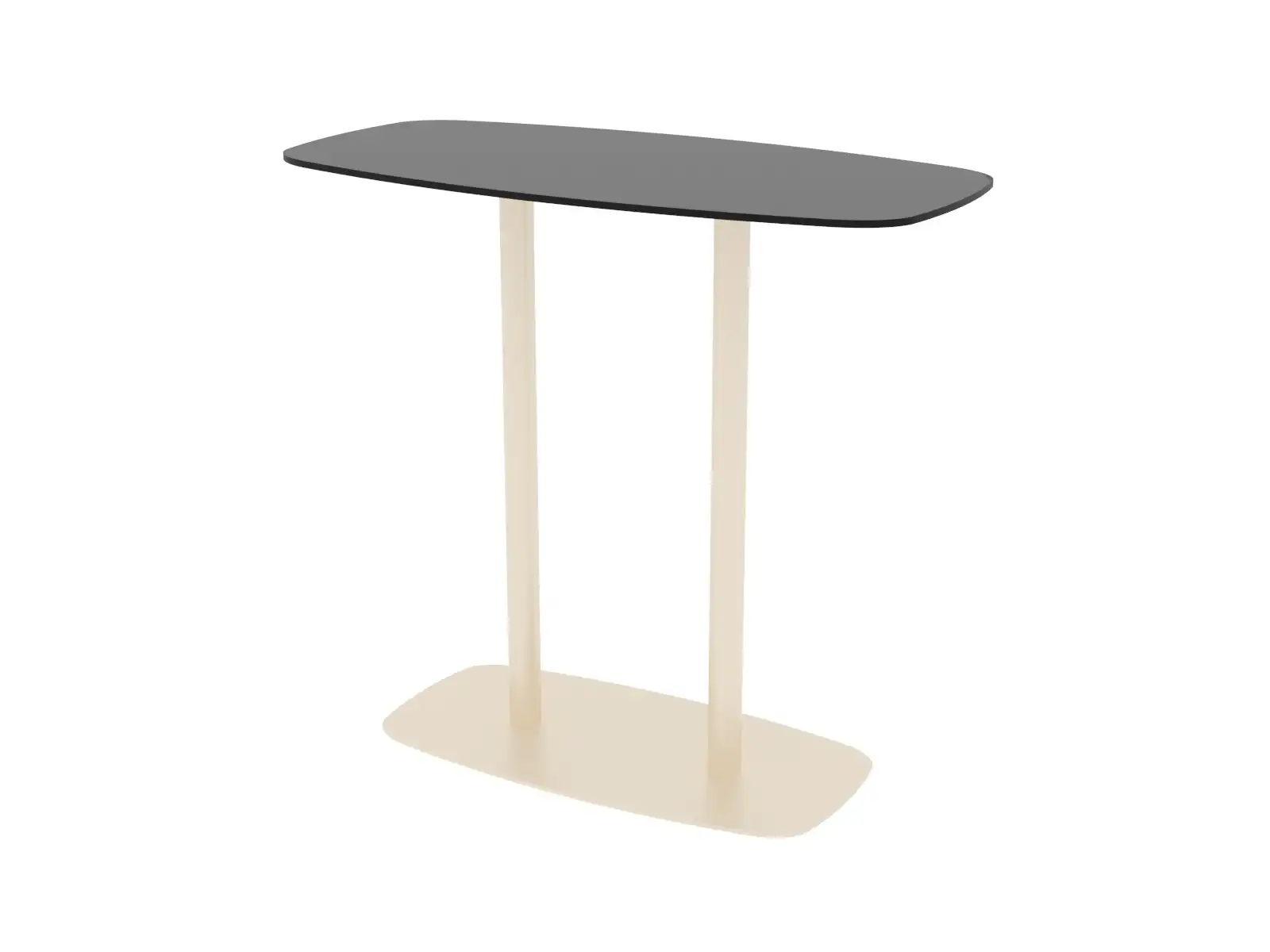 Központi lábas, különleges, modern formájú bárasztal. A talp elektrosztatikus porszórással felületkezelt 8 mm vastag acéllemez, a láb 60 mm átmérőjű acélcső, a talplemezen 4 db szintezővel a padló egyenetlenségeinek kiküszöbölésére. Az asztallap 12 mm vastag kompaktlemez, aminek felülete karcálló, anyaga tömör, nem igényel élzárást.