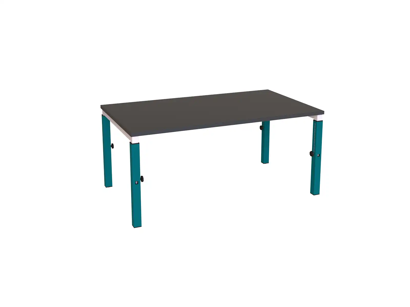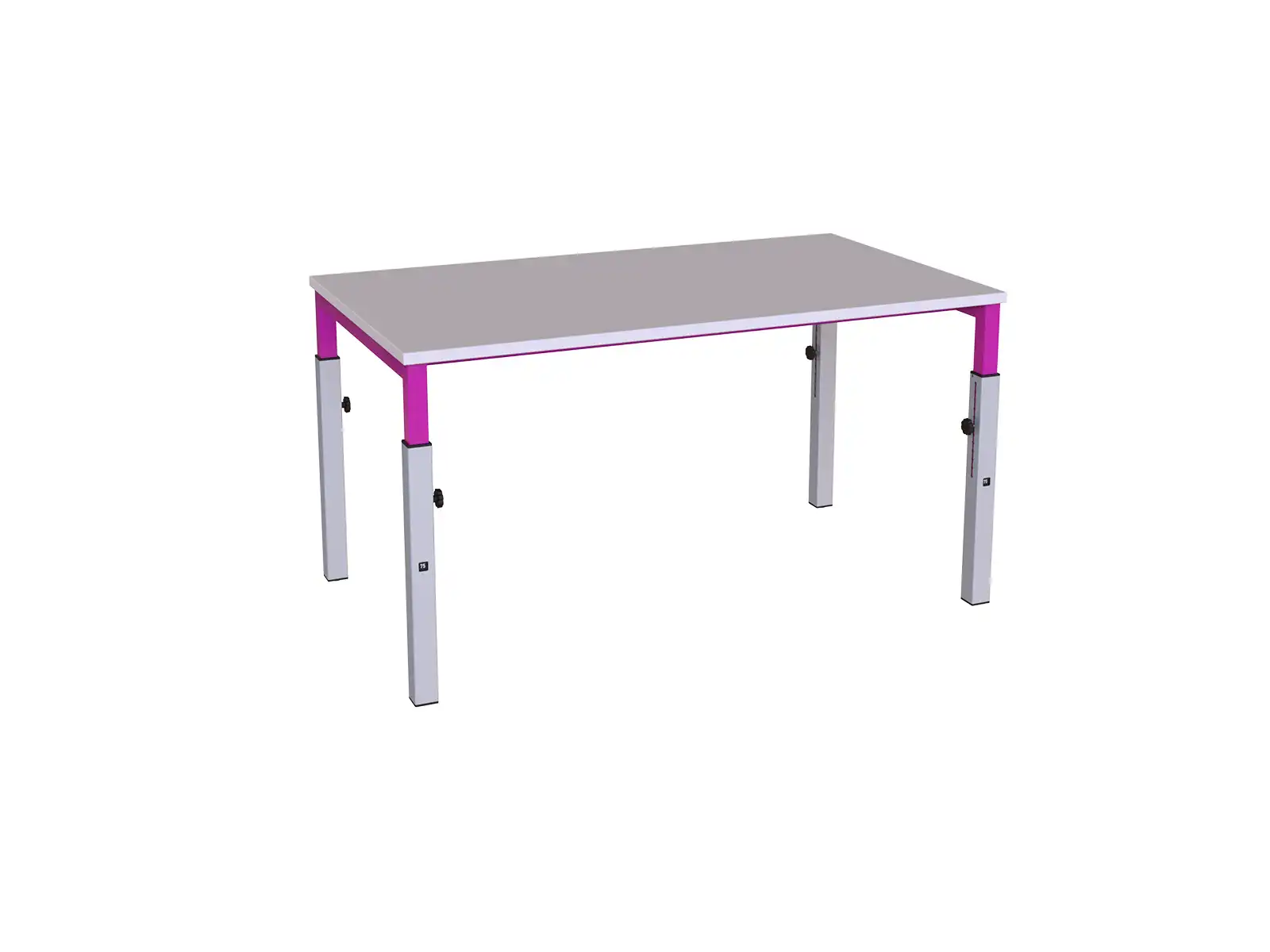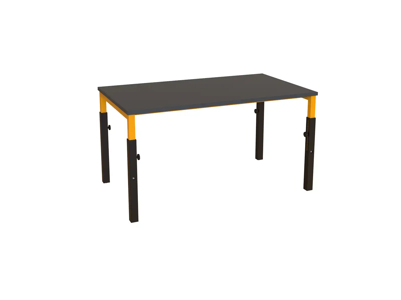 Mechanikusan állítható magasságú multifunkciós asztal, ami alkalmas akár íróasztalnak, tárgyalóasztalnak, lerakóasztalnak, vagy bármilyen funkció betöltésére, ami asztalt kíván. Az asztallap 25 mm vastag laminált faforgács lap 2 mm vastag ABS élzárással. A vázszerkezet teleszkopikusan egymásba csúszó 50x50 és 40x40 mm-es acél zártszelvények segítségével állítható. 12 fix magasságra lehet beállítani az asztalt, piskóta alakú horony segítségével. A marokcsavar kitekerésével a rögzítő tönk benyomható, így csúsztatható a láb a következő helyzetbe, melynek aktuális szám megjelölését a láb külsején levő lyukon keresztül láthatjuk. A fém lábak festésének sértetlenségét és a masszív tartást a műanyag hüvely biztosítja.