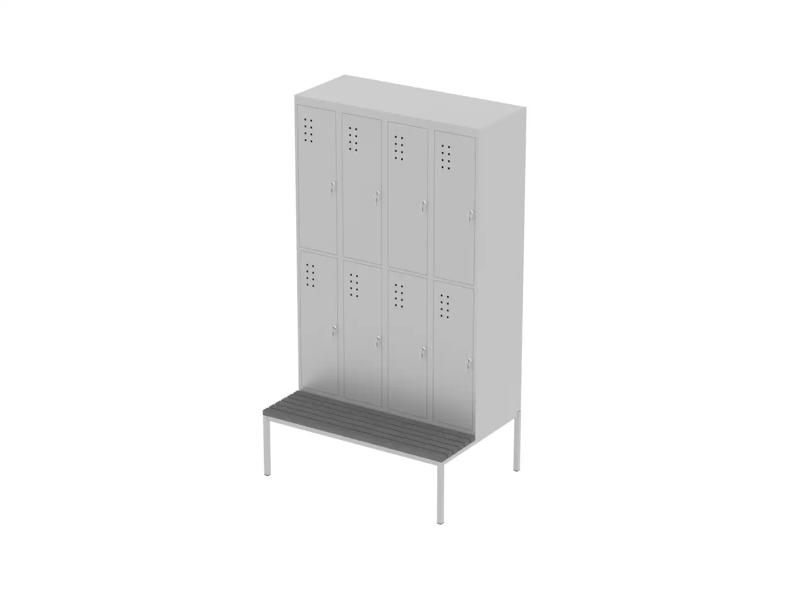 Rövidajtós osztott 8 személyes kivitel. Struktúr felületű elektrosztatikus porszórással festett I. osztályú acéllemezből készül. Szellőzés az ajtókon keresztül perforációval történik. Kétkulcsos fémbetétes hengerzárral szerelt. Az ajtók kalapprofil merevítéssel készülnek, ami megakadályozza a kifeszíthetőséget. Az ajtókon és a korpuszon elhelyezett szilikon korongok megakadályozzák a hangos becsapódást. Az akasztókampó lehetőséget nyújt a táska, kabát felakasztására, vállfatartóval. Az ülőfelület WPCő lécekből készül. A lábak 30x30 mm-es zártszelvényből készülnek szintezhető lábdugóval. RAL 7035 világosszürke színben.