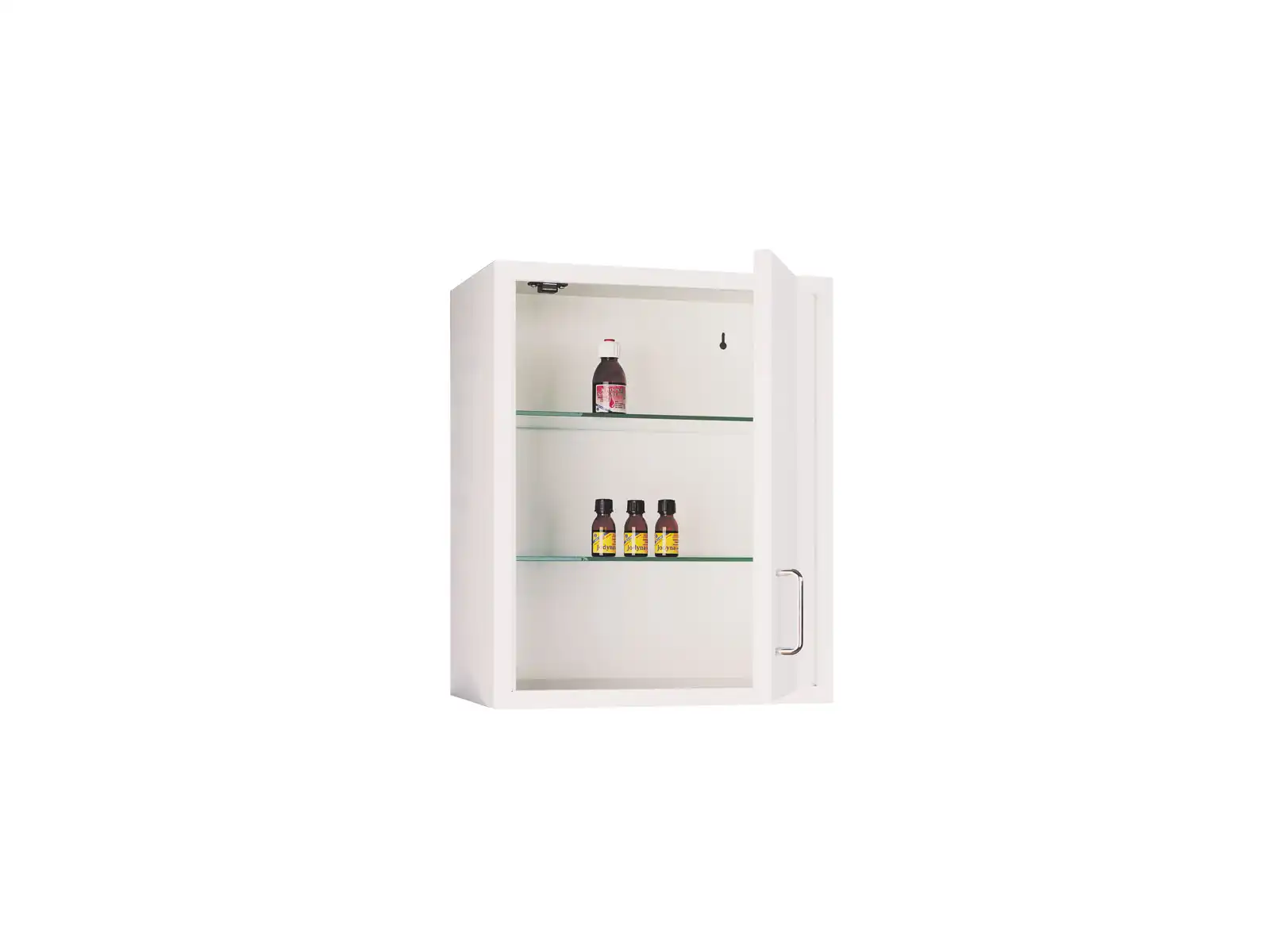 Fém orvosi felső szekrény, amely 2 darab üveg polccal van felszerelve.