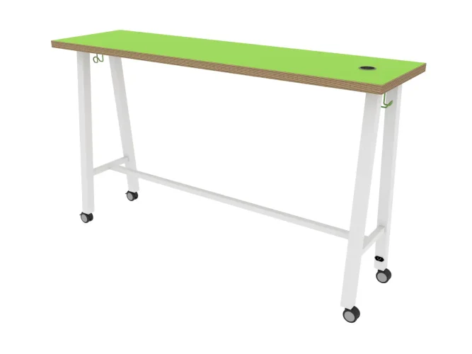 Vázszerkezet: 50x50x2 mm-es zártszelvény lábak, 30x30x1,5 mm-es zártszelvény taposóval, fém talppal, az asztallap alatt 60x20x1,5 mm-es zártszelvény vázzal, szinterezett felülettel, önbeálló görgőkkel (2 db sima, 2 db fékezhető). Az asztallap 15 mm vastag rétegelt lemez duplungolt (30 mm-es) kerettel. Az asztallap dekoritozott kivitel, élek marva, lenolajjal felületkezelve. Opcionálisan rendelhető vezeték nélküli USB töltő (az adapter az asztallap alá kerül rögzítésre). Két oldalon táskaakasztóval.