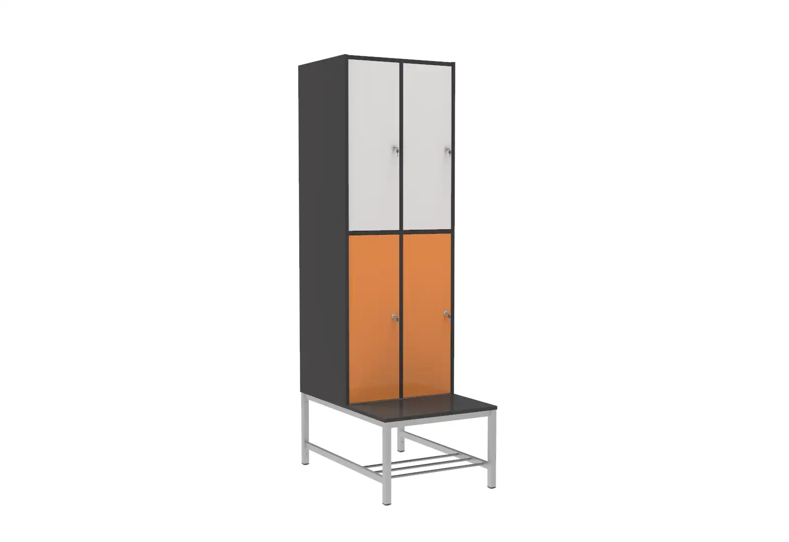 A korpusz, az ülőfelület és az ajtók 18 mm-es laminált bútorlapból készülnek ABS élzárással. A hátfal HDF lemezből van. A lábak elektrosztatikus porszórással felületkezelt 30x30 mm-es zártszelvényből készünek, a cipőtartó rács 13 mm-es acélcső pálcákból áll. A lábak végén szintezhető dugó van.Alapfelszereltség: ruhaakasztó rúd, ruhakampóval, kétkulcsos biztonsági zár, hátoldali szellőztető. Az új kialakításnak köszönhetően a szekrény teljes magassága rendelkezésre áll a pakoláshoz.