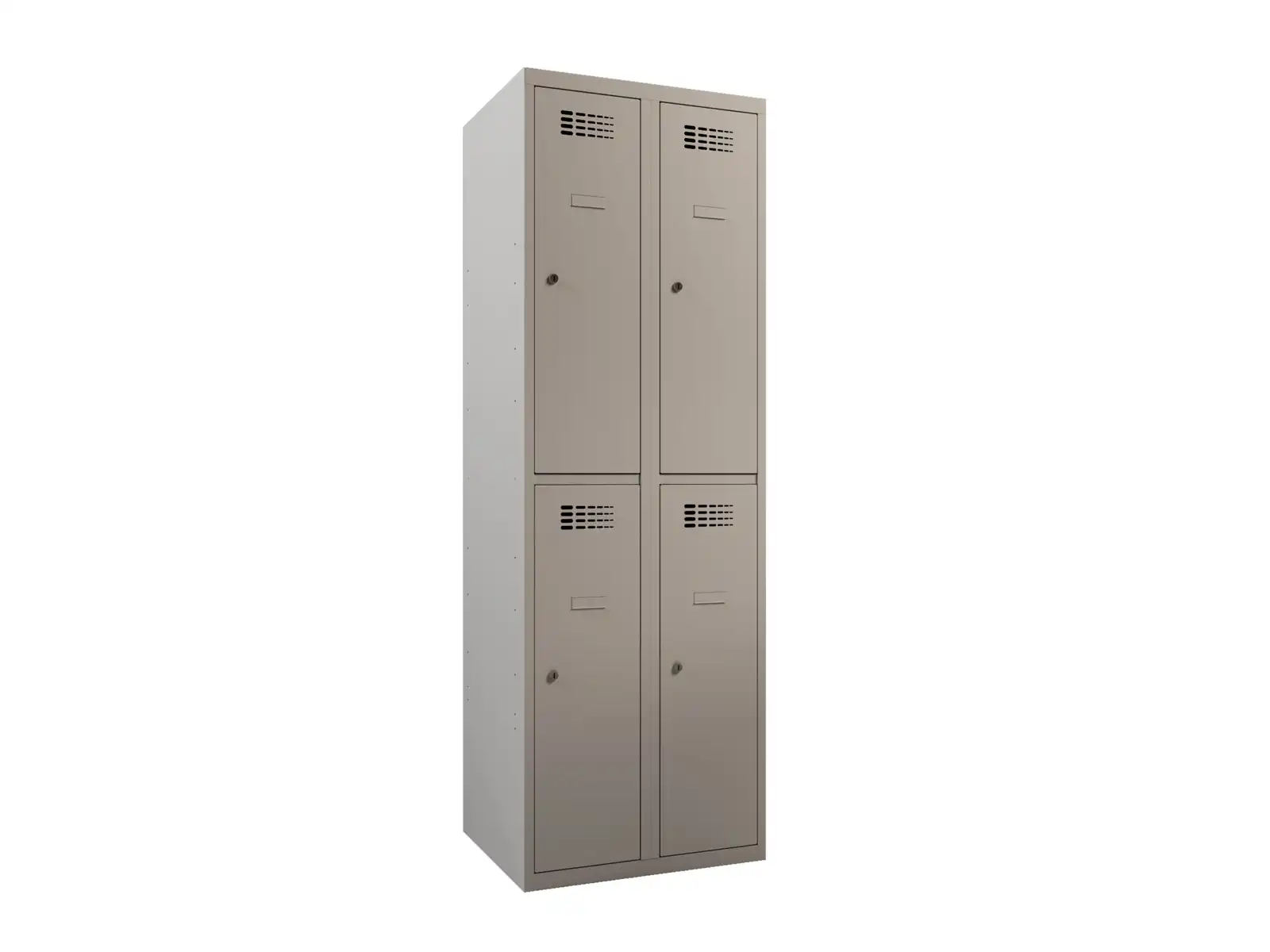 Teljes felületés elektrosztatikus porszórással festett I. osztályú acéllemezből készül, hegesztett, szoklis kivitelben. A szellőzés az ajtón perforáción keresztül történik. Alapfelszereltség: ruhaaksztó rúd akasztókampóval, névtábla tartó, kétkulcsos hengerzár. Felármentesen kérhetó lakatzárral is.