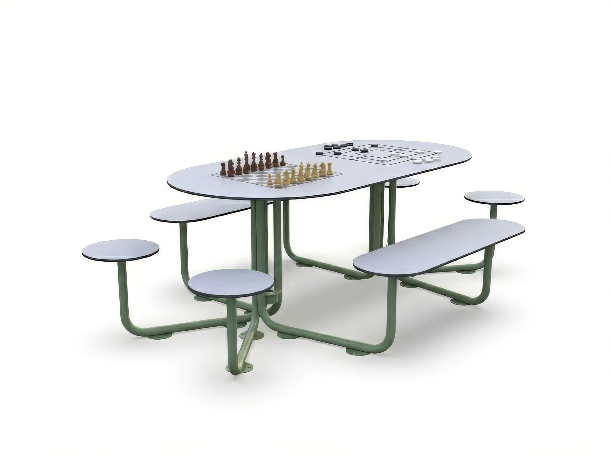 Modern kültéri sakk és malom asztal parkokba és közterekre. Vázszerkezete o40x2 mm-es és o89x2 mm-es horganyzott acélcsőből, valamint 30x30 mm-es zártszelvényből készül. A 190x95 cm asztallap és a 120x35 cm valamint o35 cm ülőlapok 12mm vastag víz és UV-álló világos szürke HPL Exterior kompaktlemezből készülnek. Az asztallapon bemart sakktábla és malom tábla helyezkedik el. Lecsavarozható kivitelben gyártjuk.