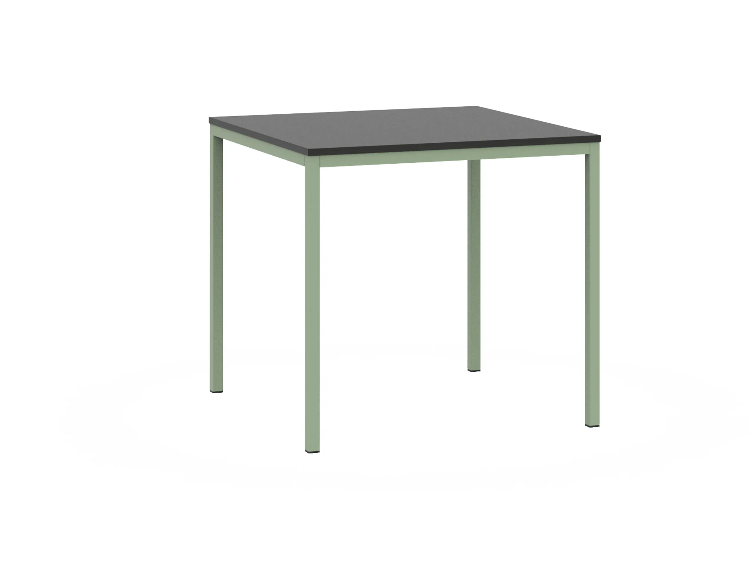 30x30x1,5 mm-es zártszelvény lábszerekezetű asztal 30x20x1,5 mm-es zártszelvény átkötővel, 80x80 cm méretű, 2 mm-es ABS élzárt 18 mm vastag laminált asztallappal , a lábak végében műanyag végzáró dugókkal.