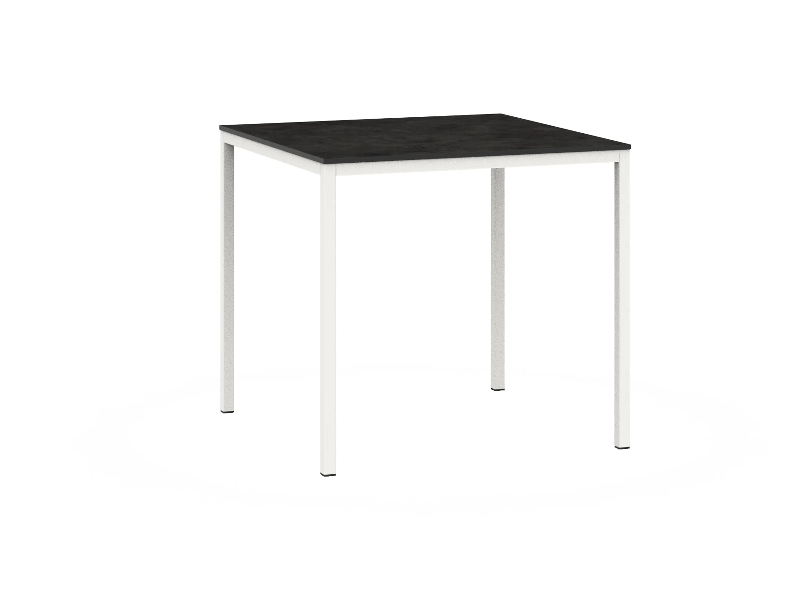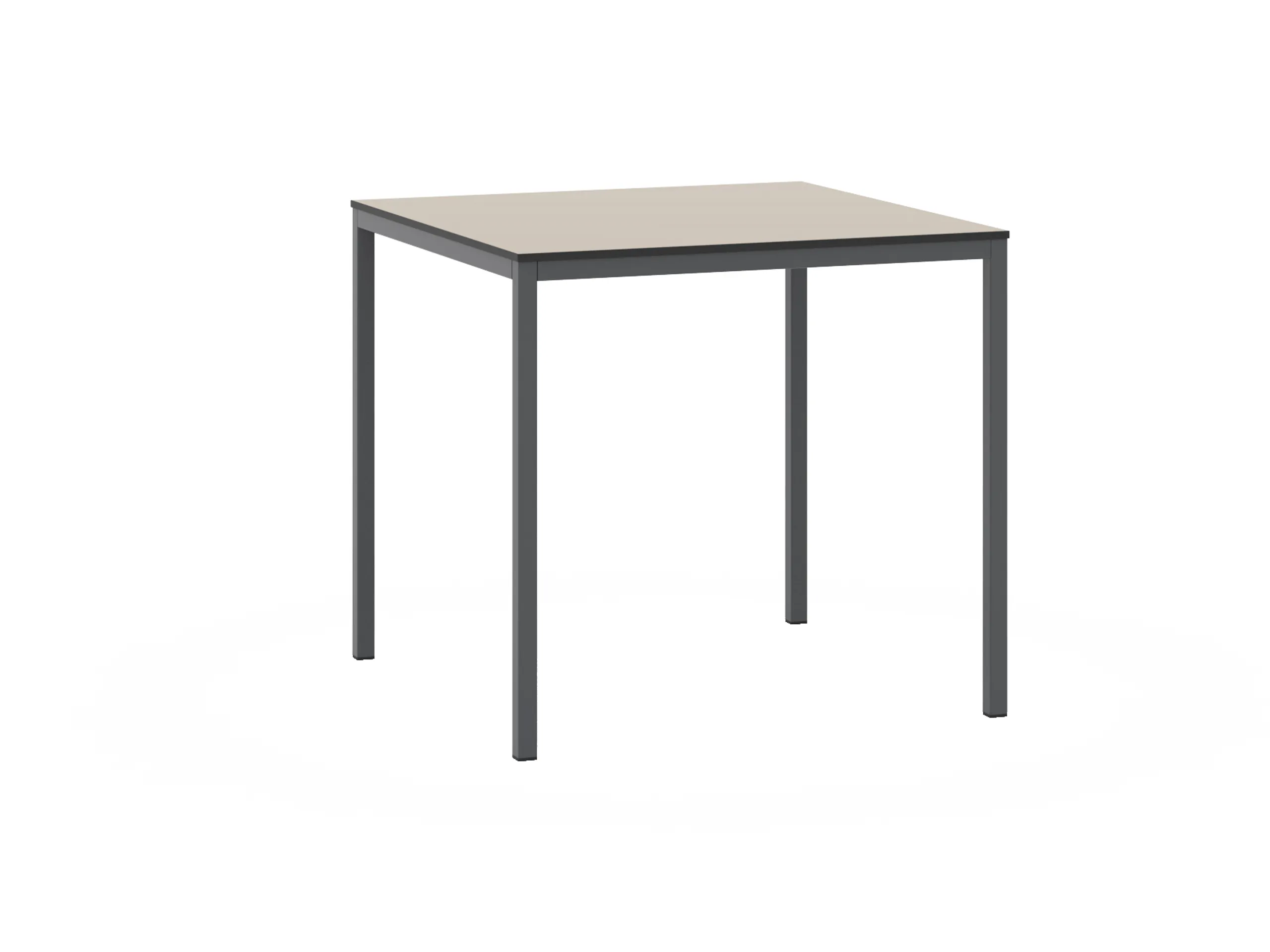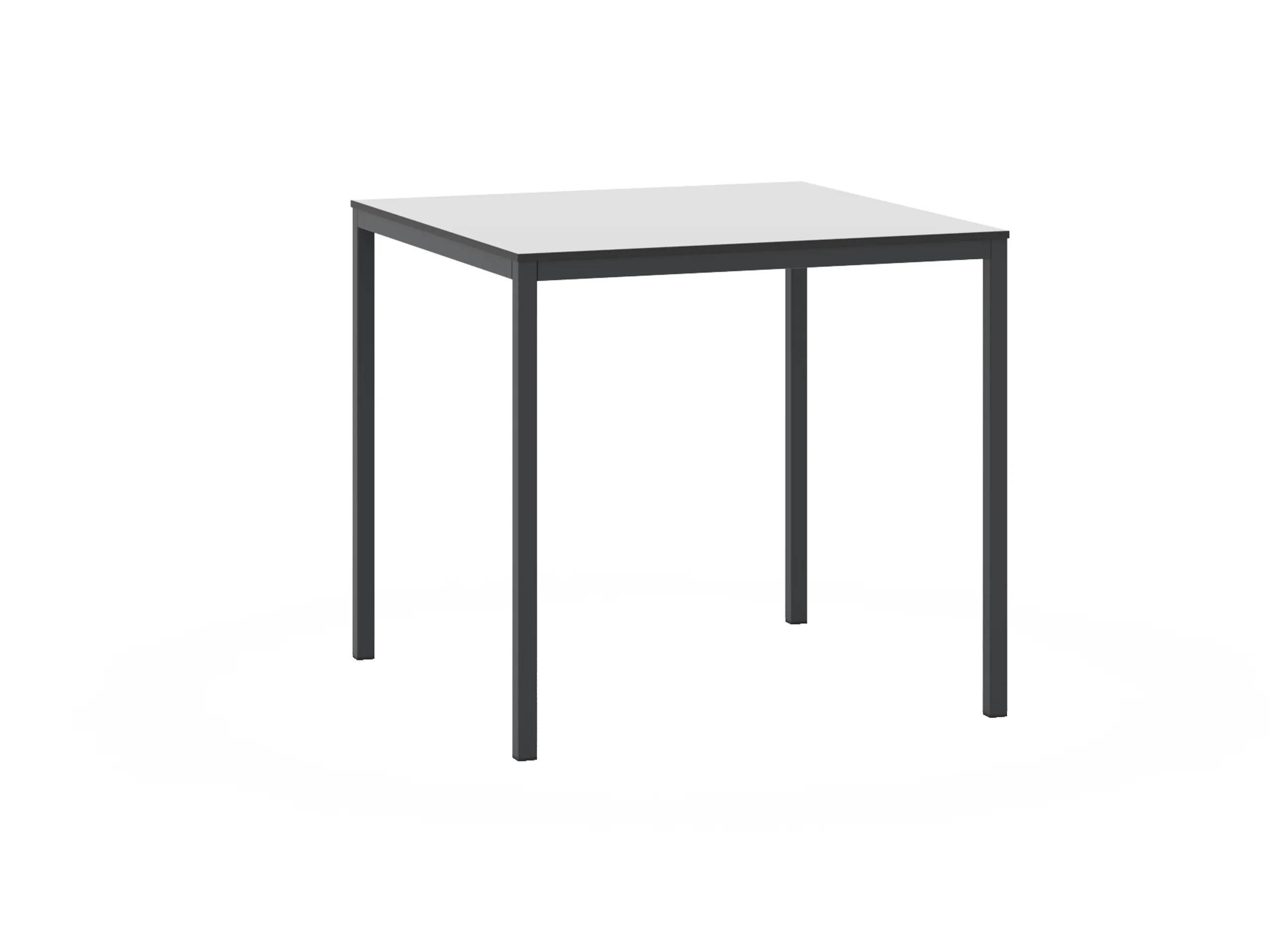 30x30x1,5 mm-es zártszelvény lábszerekezetű asztal 30x20x1,5 mm-es zártszelvény átkötővel, 80x80 cm méretű, 12 mm vastag komapktlemez asztallappal, amely karcálló és hőálló tulajdonságokkal rendelkezik, a lábak végében műanyag végzáró dugókkal.