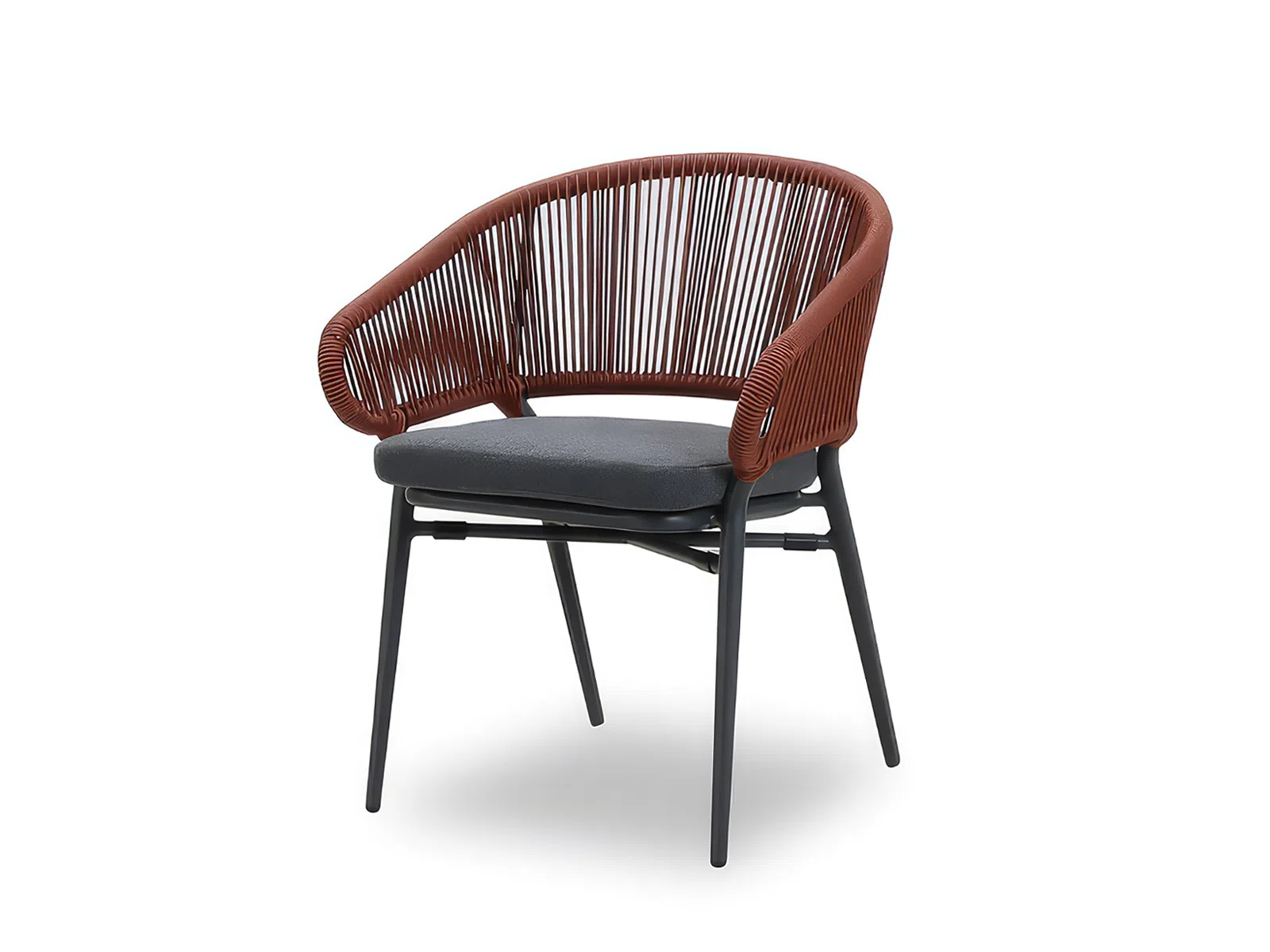 Alumíniumvázas teraszszék kötélfonott háttámlával. Az alumínium váz 28×1,5 mm-es csőből készül, antracit festéssel bevonva. A háttámla UV-álló, piros színű kötélfonatból készül. Az ülőpárna 5 cm vastag, bézs színű, időjárásálló kárpitanyagból készült. A párna levételét követően a szék rakásolható.