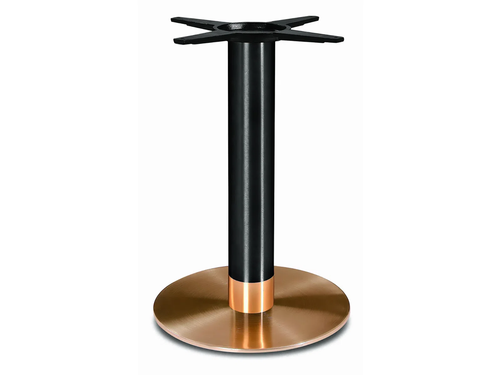 Alumínium asztalbázis, 115x4 mm-es központi oszloppal, 50 cm átmérőjű talp lemezzel. A talp lemez 1 mm vastag réz színű alumínium bevonattal készül, szálcsiszolt kivitelben. A lábak végén szintezőtalpakkal. A következő méretű asztallapokhoz ajánljuk: d70 cm, 70x70 cm és d80 cm, 80x80 cm.