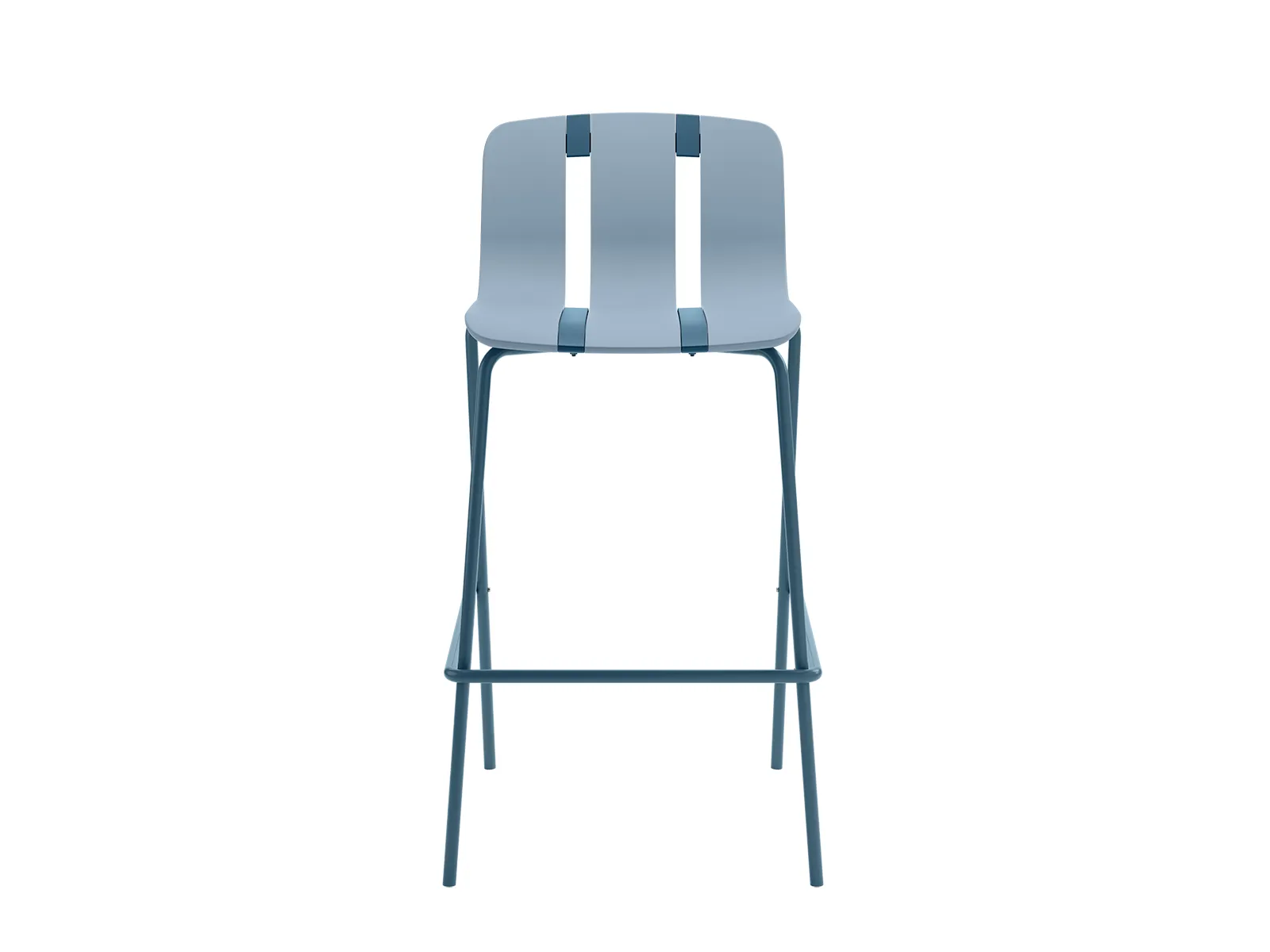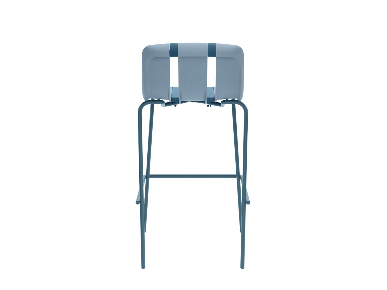 Kültéri fém vázas bárszék, porszórt festék bevonattal. A lábak 19x1,8 mm-es átmérőjű csőből készülnek. Az ülőfelülete üvegszálall erősített műaynagból készül.